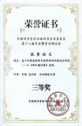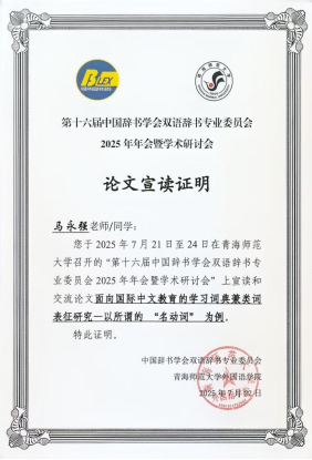 本次会议共设八个分组论坛。我院马永强老师和宫妮老师分别参与了第三组和第一组的分组论坛报告。马老师从国际中文教育的视角出发,以“名动词”为例,深入探讨了汉语学习词典微观结构中语言知识表征存在的问题,并后提出了针对性的改进策略。宫老师则系统研究了《新汉越词典》的词类标注现状,揭示词典存在的问题,并提出了相应的对策,为相关词典的编纂与修订提供了有益参考。此外,两位老师合撰的论文《基于词典数据库与语料库的词类标注研究——以〈新汉越词典〉为例》荣获本次会议优秀论文三等奖。