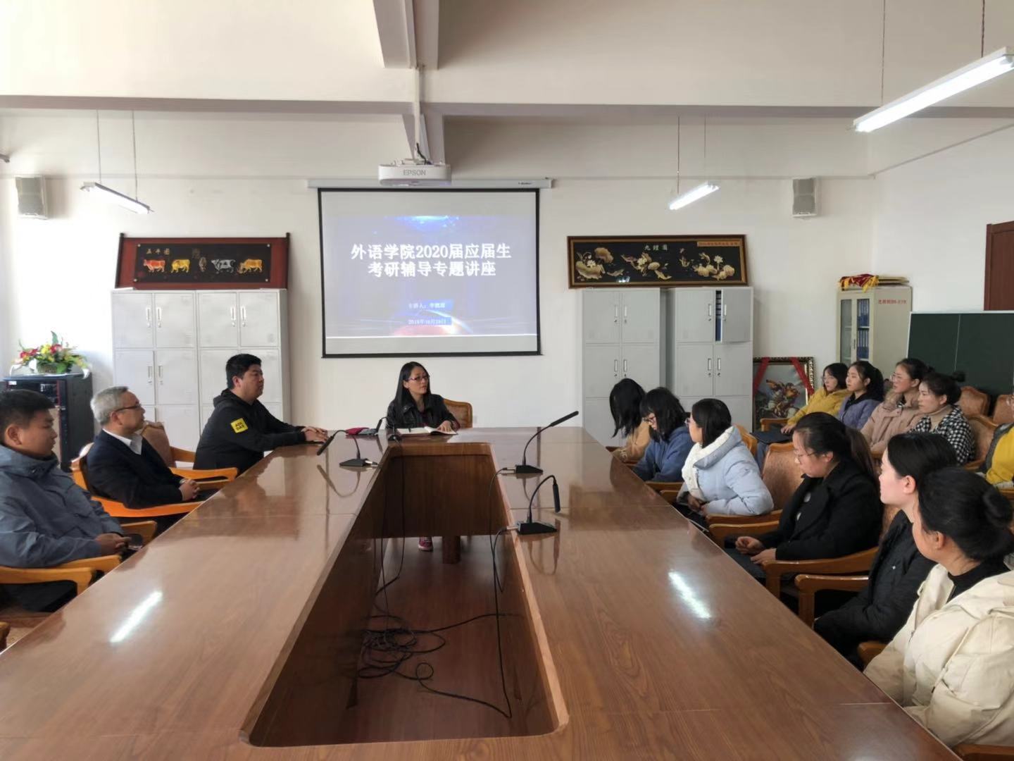 为进一步了解目前考研英语学习现状,学习考研英语过程中常见的问题、容易犯的错误的特点、症状、成因及处置对策,着力提升我院学生考研成功率,10月29日下午,我院外国语言文化研究中心主任李懿琛副教授在学院会议室举行题为《考研英语高分备考指导》大学生考研英语专题讲座,讲座现场邀请了学院相关人员和2020届毕业生40余名。
