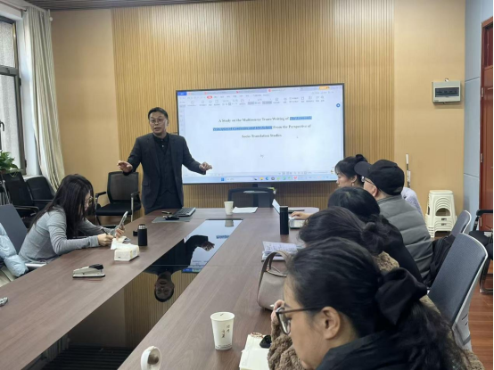 在“翻译中国”“讲好中国故事”的时代语境下,如何有效推动中华文化“走出去”,构建中国话语和叙事体系,已成为翻译学、比较文学与跨文化研究领域的核心关切。为回应这一时代命题,2025年12月2日上午,西安外国语大学教授、翻译与国际传播研究中心主任刘晓峰受邀来我院以“无本译写基础理论、研究选题、学术论文写作与发表”为主题开展专题讲座。本次讲座由英语系主任姜燕主持,学院部分教师及本硕学生共计60余人参加讲座,现场学术氛围浓厚。