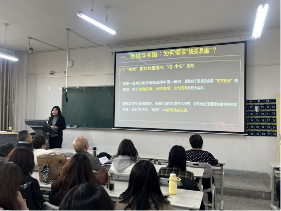 讲座伊始,苏蕊教授直指秦陇地域文学翻译传播的核心症结——传统翻译的树状模式。她指出,该模式以西方审美标准、价值观念和市场逻辑为“中心”根系,使得地域文学在“走向”世界时不可避免地陷入“被选择”“被修剪”的被动境地,最终沦为边缘话语,其丰富的本土文化内核难以完整呈现。为破解这一困局,苏教授明确提出以翻译地理学的“空间-文化-权力”理论与吉尔·德勒兹的“块茎理论”为双重理论基石,为秦陇地域文学的世界性表达探寻新路径,这一立论引发在场师生的高度关注。